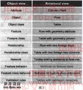 随 此外,GeoDatabase还同时支持对象视图和关系视图,能综合两者的优点。对象视图在GeoDabase中占据主导地位,其目的是提供一个接近于逻辑数据模型的数据模型、因而更接近于现实。关系视图则用于一些GeoDatabase数据的常规处理,它表示的是一些简单地理对象的特征。对象视图和关系视图的具体对应关系如图3所示。