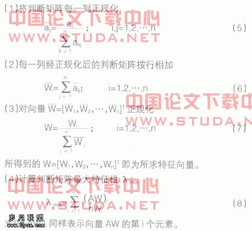 2.层次单排列及其一致性的检验。判断矩阵A的特征根问题AW=λmax W的特征向量解W,经规一化后即为同一层次相应因素对于上一层次某因素相对重要性的排序权值。这一过程称为层次单排序。计算权重的方法有和积法、方根法等。下面以和积法为例进行说明。