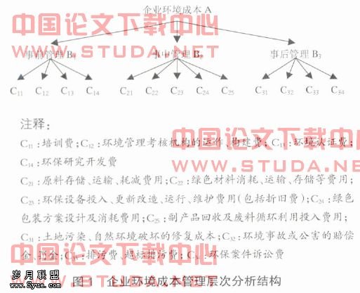 对环境成本进行分层管理需要运用层次分析法(AHP),层次分析法体现了人类运用过去已有的知识与经验,对客观事物进行分解、判断、综合,并据此求得最佳规划方案的能力。它把人的决策思维过程层次化、数量化、模型化,并用数学手段为分析、决策提供定量的依据,特别是在目标因素结构复杂、各个因素的重要性、影响力或优先度常常难以量化、缺少必要数据的情况下,需要将决策者的经验判断定量化时该法非常实用。该方法适用于多准则、多目标或无结构特征的复杂问题的决策分析,可以将定量分析与定性分析较好地结合起来。大量的规划问题和确定加权值的问题均可用层次分析法获得满意的结果,广泛用于管理评价、比较、资源规划分析、事故致因分析、人员素质测评及安全经济分析等方面。具体到本文的研究有以下几点原因: