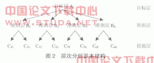 分析研究对象所包含的因素及其相互关系。将有关的各个因素按照不同的属性自上而下地分解成若干层次,同一层次的诸因素从属于上一层的因素或对上一层因素有影响,同时又支配下一层的因素或受下一层因素的作用。层次结构通常分为目标层(最高层)、准则层(中间层)和措施层(最低层),基本示意图如图2所示: