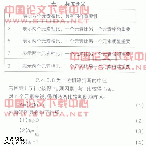 1.构造判断矩阵。判断矩阵元素的值反映了人们对各因素相对重要性(或优劣、偏好、强度等)的认识,一般采用1-9及其倒数的标度方法。1-9的标度方法是将思维判断数量化的一种好方法。首先,在区分事物质的差别时,人们总是用相同、较强、强、很强、极端强的语言,再进一步细分,可以在相邻的两级中插入折衷的提法,因此对于大多数决策判断来说1-9级的标度是适用的。其次,心的实验表明,大多数人对不同事物在相同属性上差别的分辨能力在5-9级之间,采用1-9的标度反映多数人的判断能力。第三,当被比较的元素其属性处于不同的数量级,一般需要将高数量级的元素进一步分解,这可以保证被比较元素在所考虑的属性上有同一个数量级或比较接近,从而适用于1-9的标度。