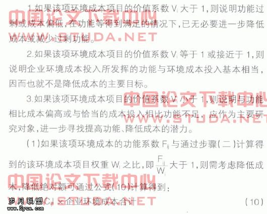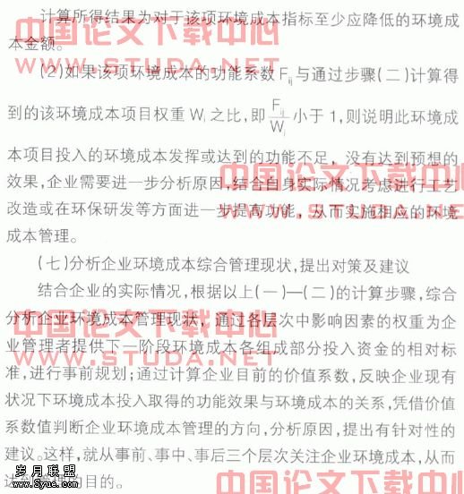 分析企业环境成本现状,借助产品功能成本决策的思路,通过功能与成本之间的相互关系分析企业目前环境成本价值,据以判断企业环境成本管理的方向,分析原因,采用一定的技术方法,使环境成本管理真正发挥作用。