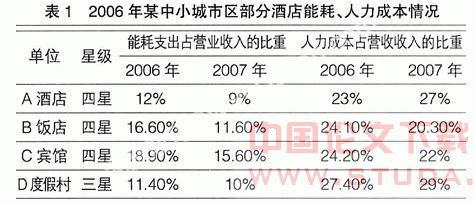 通过对某中小城市具有代表性的几家酒店的调查,能耗和人力资本两项支出约占营业收入的35%至40%。为了降低成本,各酒店采取各种节能措施,压缩人员编制,节约人力成本。2007年A酒店和D度假村为创建评定绿色旅游酒店,在节能上用尽心思,也只降低了2-3个百分点,而同期人力成本却上升了2-4个百分点。在调研中,酒店总经理对水、电、气的市场高价反应最为强烈。物价上涨而酒店的餐标却没有上涨,新劳动法实施后人力成本上升让酒店在经营中更头痛。