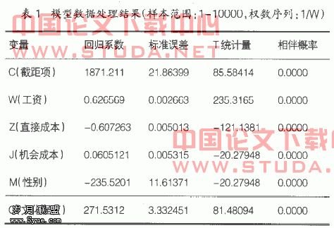利用2004年在柳州务工的广西农民工状况调查获得的有效样本数据,借助于EViews3.1软件,采用WLS(加权最小二乘)方法建立的模型为: