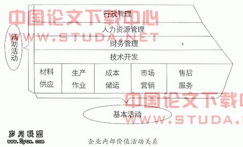 企业内部价值链:企业内部价值链中的价值活动可划分为基本活动和辅助活动两大类。前者如材料供应、生产作业等,后者如技术开发、人力资源管理等,二者皆可进一步划分为若干显著不同的具体活动。如下图所示: