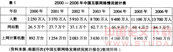 据互联网信息中心(CNNIC)发布的《第19次中国互联网络发展状况统计报告》显示,截止到2006年底,我国内地网民人数达到1. 37亿,占中国人口总数的10. 5%。与2005年(网民总数为11 100万人,占人口总数的8. 5%)相比,我国网民总数一年增加2 600万人,增长率为23. 4%,是历年来网民增长最多的一年,首次突破10%,意味着每10个中国人中就有1个是网民。同时,《中国互联网络发展状况统计报告》还显示,截止到2006年底,中国网站总数约为84. 3万个,年增长近15万个。中国网页总数有44. 7亿个,与去年同期相比增加20. 7亿个,增长率为86. 3%。上网机总数为5 940万台。中国域名总数则接近411万个,其中CN下注册的域名数为180万个,与去年同期相比增加了70万个,增长率达64. 4%,占总域名数的43. 9%。COM域名数194万个,占总域名数的47%,但CN域名数的增长速度高于COM域名。总之,在我国无论是网络消费的人数,还是规模都在不断扩大(见表1)。