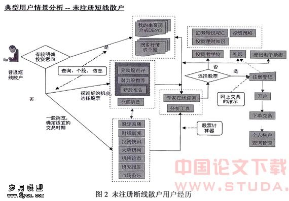 此实验帮助学生理解用户经历设计7要素的应用,掌握网站用户经历设计流程,了解满意的用户经历设计对企业赢得优质客户和利润的重要意义。学生以小组为单位讨论、分析、比较站点的用户经历设计,了解实例;然后每组分别为所选择的产品/服务设定目标客户群,围绕“用户经历7要素”为每个客户群设计网站情节,有效整合网上网下经历,作出用户经历流程图,如图2所示为证券投资类站点目标客户群之一―“未注册短线散户”的用户经历设计流程。