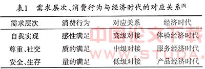 1.人类需求层次、消费观念与经济时代的对应关系。马斯洛把人的需求分为五个层次,认为人总是在满足了低层次需求之后,才将注意力转向更高层次的需求上。菲利普·科特勒把人类的消费行为分为:量的满足、质的满足和感性满足三个阶段。在感性满足阶段,消费者看重的不是产品数量和质量,而是为了一种感情上的渴望而追求商品与理想自我概念的吻合。从人类不断增长的需求和经济发展的内在联系来分析,人类不同层次的需求及其消费行为可以和不同的经济时代实现很好的对接(见表1)。经济演进的过程伴随着消费形态的改变,体验经济的出现反映人类的消费行为和消费心理正在进入一种新的高级形态。