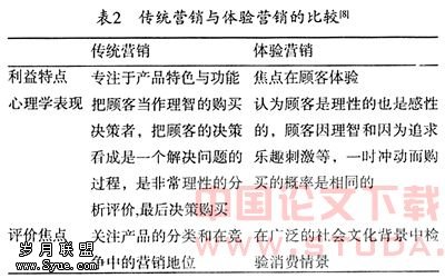 2.体验营销区别于传统营销的特点。体验营销最主要的特点是以产品或服务为媒介,企业和消费者进行行为和心理的互动,从而实现两者的深层认同。作为一种新颖的营销方式,体验营销与传统营销相比有自身的特点(如表2所示):(1)以消费者的体验为中心,体验营销注重消费过程中的经历对感觉、内心和思想的触动,从而把企业、品牌和消费者的生活方式紧密相连。(2)以社会文化为导向,体验营销不再把产品和竞争的分类限定在狭窄视野里,而是把产品或服务置于广泛的社会文化背景下,寻找内在联系,形成协同体验,注重购买后的顾客反映,努力提高品牌的忠诚度。(3)以感性营销为支点,体验营销试图寻找导致消费者情感变化的敏感点,并激发其积极的情感,使消费者的求美心理和浓郁的人情味都得到了满足。