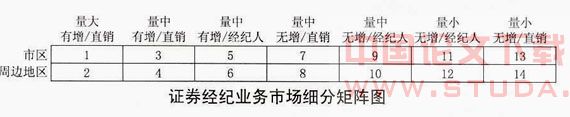 实现差异化战略的前提是市场细分,即把市场划分为各次级单元。关于如何细分市场,或者说以何种指标作为市场细分的依据,迈克尔·波特提供了四类细分市场的变量。(1)产品种类。为了辨识产品细分市场,应当把产业中生产或有可能生产的不同的产品类型隔离开来。但是,从目前证券界的业态来看,各家营业部的经纪业务结构雷同,产品无差异。对此,理论界和业内都寄希望于通过提供证券增值服务来形成产品差异。由此,我们把证券经纪产品分为两类:有增值服务和无增值服务,简称“有增”和“无增”。(2)买方类型。即考察产业最终买方的所有不同类型。经纪业务的买方是投资者,通常营业部从投资者的规模一一成交量大小来区分买方的类型。由此,我们把买方类型分为:“量大”、“量中”和“量小”。具体的划分标准应当根据各地区市场的实际情况而定。(3)销售渠道。经纪业务目前的销售渠道有两种:营业部直接销售和经纪人代销,简称直销和代销。(4)买方的地理位置。地理位置可以作为成本驱动因素而对市场细分具有直接的重要性。我们简单地将买方的地理位置划分为中心城区和周边地区。这里的中心城区一般指地级市以上行政区域,营业部数量众多,投资者聚集;而周边地区一般指县级市、乡镇、等。