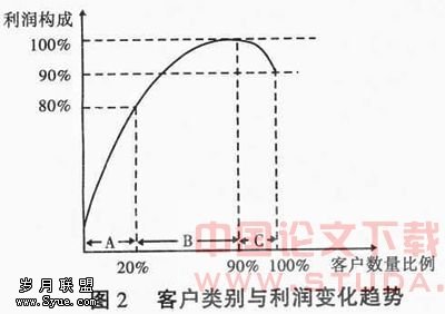 客户所处的阶段随时间而变化,企业的客户很多,面对数以百计或数以千计的客户,如果用机建立客户资料库,容易引起混乱。为了实现最大客户收益率,在此借助于ABC客户分类法, ABC分类法是一种最常用、最简洁的方法,其原理是根据企业利润构成区分客户。我们按照企业利润额来源大小对客户进行排序后发现,企业80%的利润来源于20%的客户,70%的客户只提供了不足20%的利润,另10%的客户不仅不会为企业带来任何利益,甚至会削弱企业的赢力水平。这种情况可以运用帕雷托曲线描述,如图2所示。根据企业利润额的构成情况,把客户群分为关键客户(A类客户)、主要客户(B类客户)、普通客户(C类客户)三个类别。
