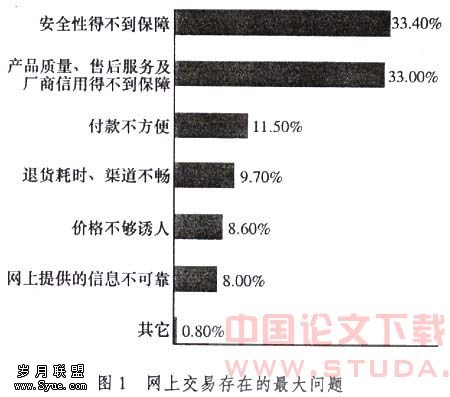 目前,消费者认为网上交易存在的最大问题如图1所示:从消费者选择购买的商品种类、付款和商品配送方式以及用户对网络交易的看法上可以发现,用户对于网络商品在购买、付款和配送方面都缺乏足够的信任感。这种不信任感主要采自于消费者对网络交易的安全性以及对商品质量、售后服务和网站信誉的怀疑等方面。作为一种新的生活观念和消费观念,网上购物要深人人心还要有一个循序渐进的过程。从传统的商场购物到购物,的确需要有一定的胆量。因为,在人们的印象中,邮寄购物的信用度是最差的。不要说款汇出了而货物却寄不回来,就是货物来了,满不满意也是一个问题,而货物如果不满意能否退货,如何退货还是一个问题。面对如此多的问题,要消费者毫不犹豫地进行网上购物,还需要一段时间让消费者来逐步地对网上购物树立信心。