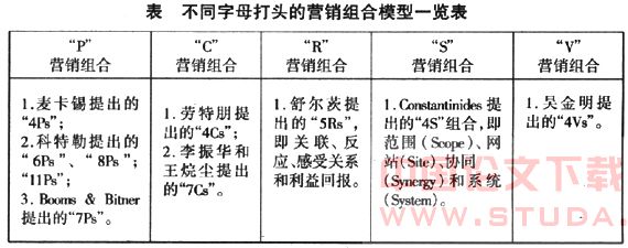 因此,综观国内外关于营销组合因素的讨论,笔者可以归纳为一个以不同字母打头的营销组合模型表(见表)。