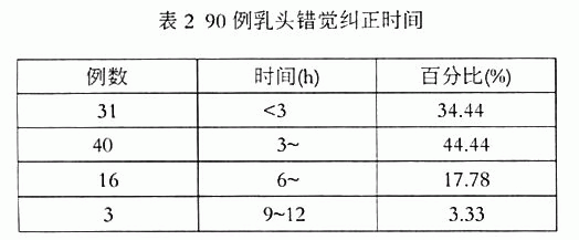 从调查情况看,有3次人工喂养即已产生乳头错觉,个别1次也可产生乳头错觉,说明母乳喂养是一种脆弱的易变行为,所以应尽可能预防发生乳头错觉。