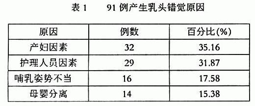 乳头错觉是指新生儿觅食反射强烈,但触及母亲乳头时即避开乳头避开哭闹拒食,烦躁不安;或触及乳头即撮口吸吮致含接困难;或嘴张大但不含接不吸吮等待乳汁流入。若这些现象不及时纠正,常导致母乳喂养失败。我们通过对这91例产生了乳头错觉的原因进行综合分析,进行了针对性纠正指导,确保了母乳喂养的成功。