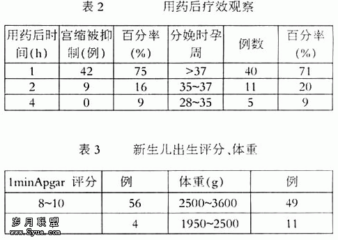 表2显示:用药后1h宫缩被抑制有42例,用药后2h宫缩被抑制有9例,用药后4h仍有5例宫缩未能被抑制以至保胎不成功;分娩时孕周>37周有40例,35~37周有11例,总有效率为91%。5例保胎失败者中有初产妇4例,其中2例合并急性阑尾炎,1例血小板减少,1例双胎;经产妇1例为双胎妊娠者。