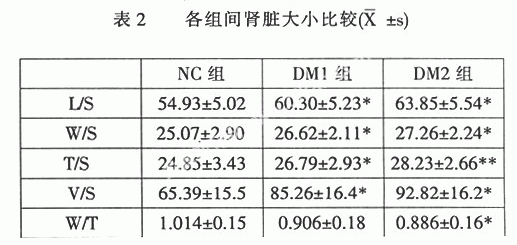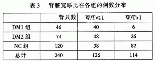 DM1、2组标准化的肾脏长径(L)、宽径(W)、厚径(T)和体积(V)均比NC组增大,有显著性差异,DM1、2组间无明显统计学差异,其中DM2组肾脏厚径单一增大时P<0.01,宽径:厚径≤1者在整个DM组中占73.3%,而在正常组中只占31.7%,可见DM患者中肾脏体积增大以厚径增加为主,主要表现肾脏肿大(见表2、表3)。