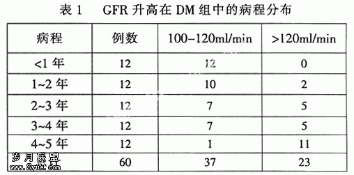 60例DM患者中有23例GFR ≥120 ml/min,占38.3 %,其中大部分为病程较长者(见表1)。实测GFR介于128-163 ml/min,平均141.22±10.34ml/min,GFR的高低与病程无明显关系。