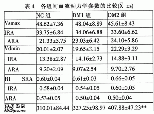 DM2组标准化的肾血流量(Q)比NC组及DM1组明显增高,有显著性差异,DM1组与NC组间相比肾脏血流量无明显差异。三组间收缩期最大血流速度(Vsmax)、舒张末期最低血流速度(Vdmin)、阻力指数(RI)均未见明显统计学差异(见表4)。