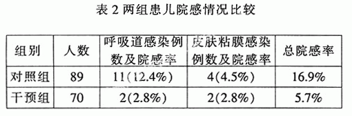 两组患儿都进行常规护理,对干预组制订统一的护理干预措施,具体措施如下:①病床的安排:告知每位护理人员此项研究的目的及方法,符合条件的患儿入院后尽量与3岁以上患儿分房收治;②入院即做好家长的宣教,让家长了解到预防感染的重要性,取得家长的配合,尽量减少探视或不探视。家长要勤洗手,注意个人卫生。如家长有感染性疾病,应更换陪人或做好相应的防范措施;③住院期间患儿活动局限于本科室内,制止患儿到不同病种病室串门,防止交叉感染。发现感染先兆及时通知医生处理;④每天晨晚间护理一人一抹布,用0.5%84消毒液湿抺2次,被血液体液污染时随时消毒,通过物表细菌培养监测,将细菌数控制在<10个/cm2;⑤病房空气消毒要求:空气消毒机24h开启,每天通风2次,每次15-30分,通过物表细菌培养监测,确定空气细菌数<500cfu/m3,如果细菌数超标,马上分析原因,及时进行改进;⑥保持床单及被褥的平整松软及干燥,床单被套最多7天一换,被污染后及时更换;⑦医护人员护理完别的病人后,不管是否感染性疾病患儿,均洗手后再护理该组患儿。医护人员如有感冒等,均应戴好口罩再护理患儿。严格无菌操作;⑧对对照组的临床资料进行回顾性统计,对干预组的资料进行统计,制订调查表格,对159例病例逐一进行查阅登记。从有无院感、院感种类、使用免疫抑制剂情况、使用提高机体抵抗力的药物(免疫球蛋白)情况等5个方面进行综合分析,以院感率及种类作为分析的结局,进行比较。