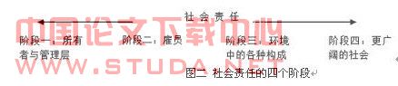 企业社会责任这一概念是1924年美国学者奥立佛·谢尔顿(Oliver Sheldon)首先提出的。著名管家阿奇·B·卡罗尔认为,企业社会责任是社会寄希望于企业履行的义务,社会不仅要求企业实现其上的使命,而且期望其能够遵法度,重伦理,行公益。因此,完整的企业社会责任,是企业的经济责任、责任、伦理责任和慈善责任之和。社会经济学观点认为,管理当局的社会责任不只是创造利润,还包括保护和增进社会福利,公司并非只是对股东负责的独立实体,还要对社会负责。企业社会责任一般包括对顾客者、员工、竞争对手、股东、合作伙伴、批发商和供应商以及节约资源和保护环境等责任。按照履行社会责任的深度,分为四个阶段,如图二所示。